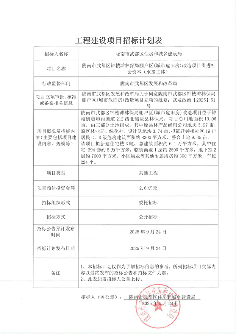 隴南市武都區(qū)鐘樓灘林保局棚戶區(qū)(城市危舊房)改造項目引進社會資本(承接主體)