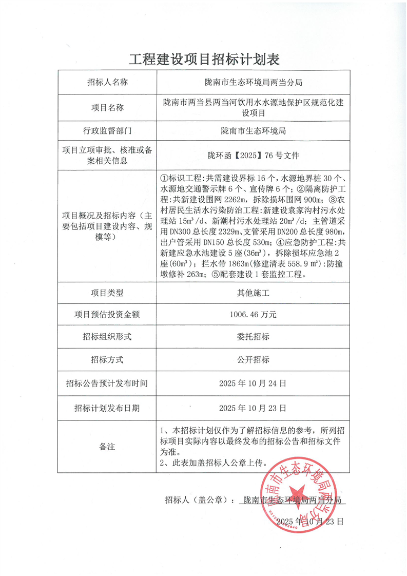 隴南市兩當(dāng)縣兩當(dāng)河飲用水水源地保護(hù)區(qū)規(guī)范化建設(shè)項(xiàng)目